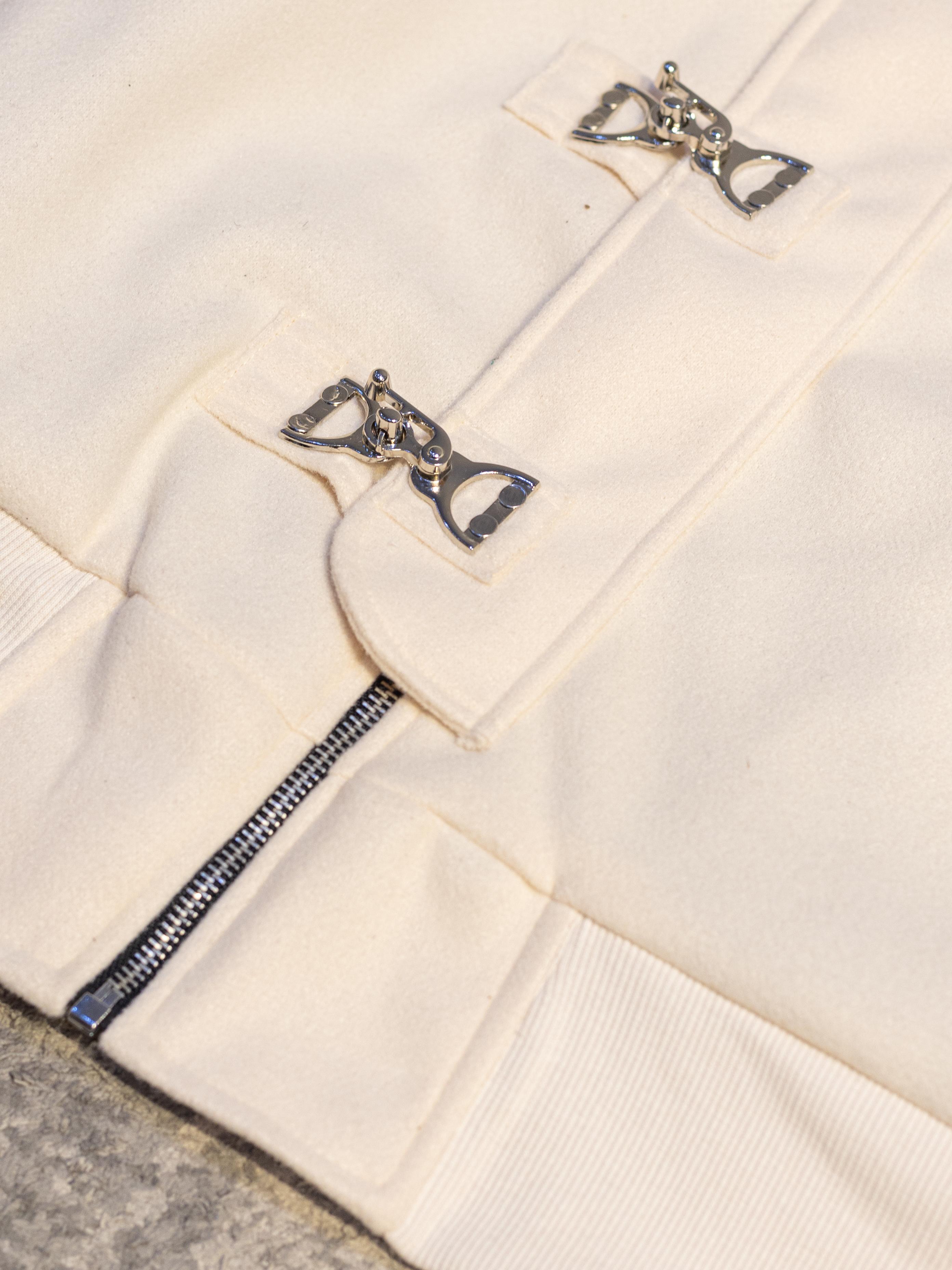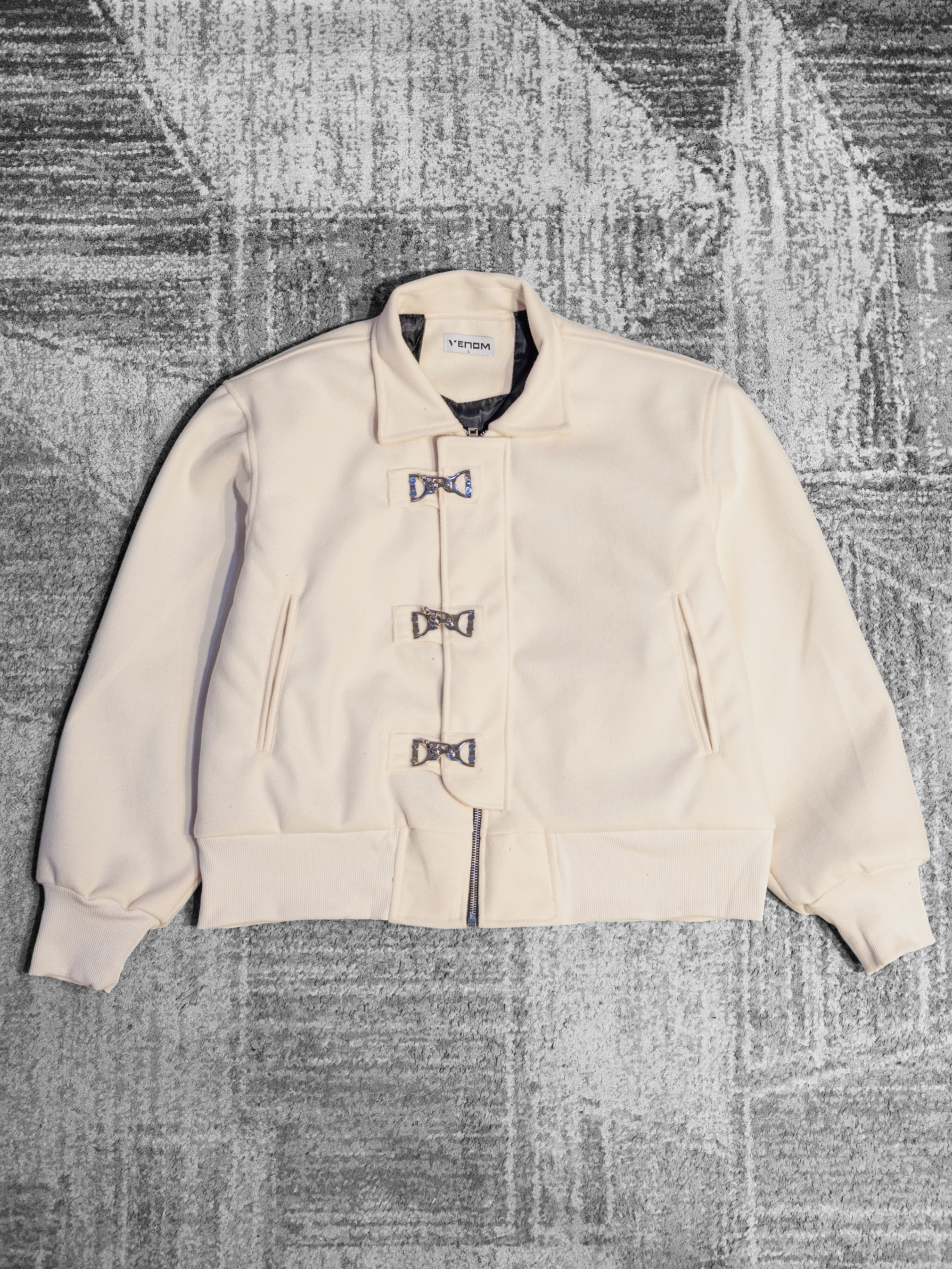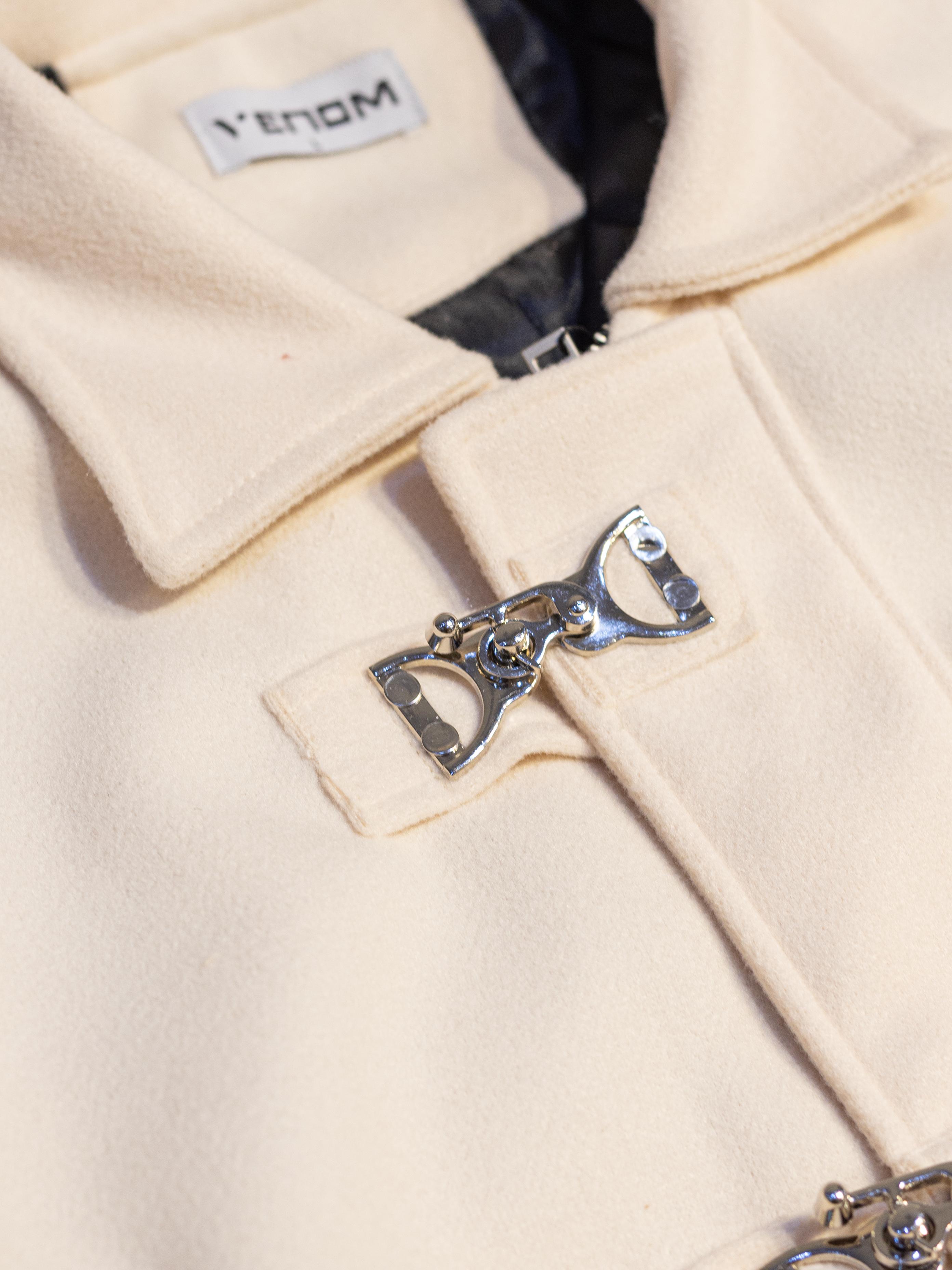 A burgundy melton wool jacket with a cropped, structured fit, featuring metal clasp front closures with a concealed zipper, side pockets, and ribbed cuffs and hem for a clean, modern look.